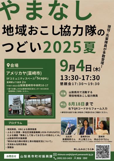 この度、9月4日に韮崎市アメリカヤで開催された山梨県地域おこし協力隊交流会「やまなし地域おこし協力隊のつどい2025夏」に、当法人統括部長の小川が企画、当日司会として参画いたしましたのでご報告させていただきます。