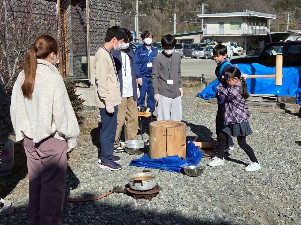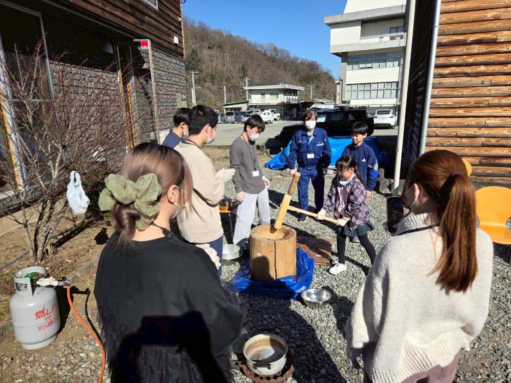 都留文科大学「ぷらっとハウス」の皆さんと協力し、青空の下で元気よくお餅をつけました。